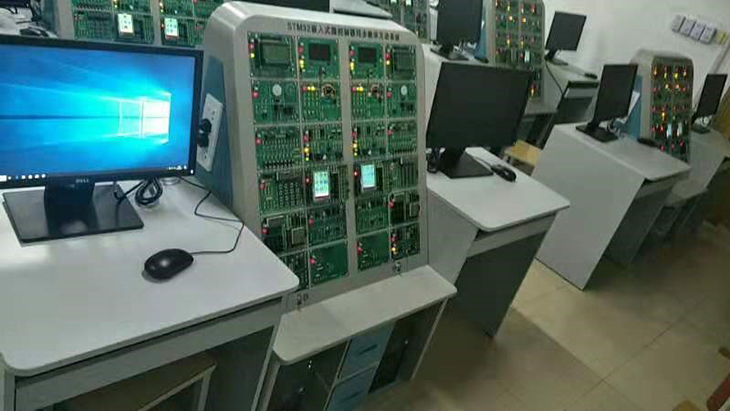 6)平臺下端兩側擺放電腦主機,主機中間另有兩個(gè)抽屜存放實(shí)驗器材。雙工位同步教學(xué)實(shí)驗裝置。平臺上部擺放2個(gè)工位的專(zhuān)業(yè)課程教學(xué)模塊至少有12塊,分體式結構、模塊化設計,可根據教學(xué)任務(wù)的不同進(jìn)行模塊更換;