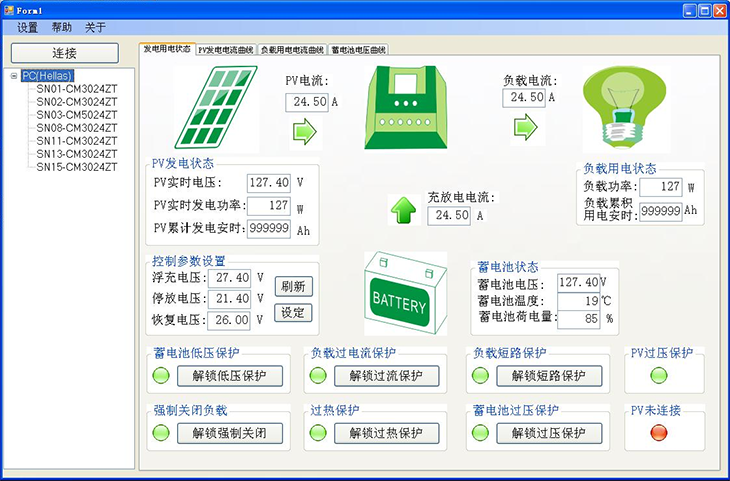 完成實(shí)驗時(shí)數據的讀取,可監測太陽(yáng)能電池組的電壓和電流;蓄電池電壓、電流,并網(wǎng)逆變器輸出的電壓和電流;離網(wǎng)逆變器輸出的電壓和電流。