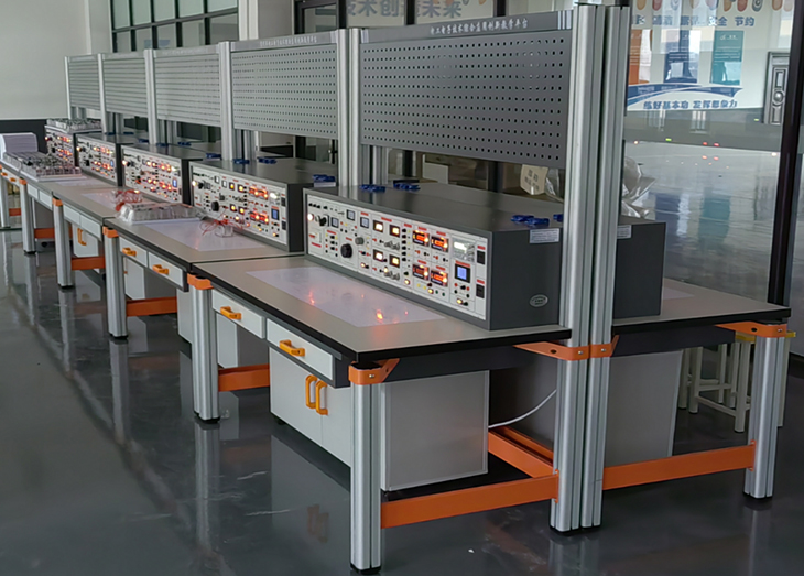 實(shí)訓桌后面二支截面尺寸70×70mm桌腳向上延伸,與一次成型鋁壓鑄框架連接構件構成(非焊接工藝)牢固的支架,與網(wǎng)孔工具掛板、儀器架、電源控制箱組成一個(gè)完整的實(shí)訓屏。