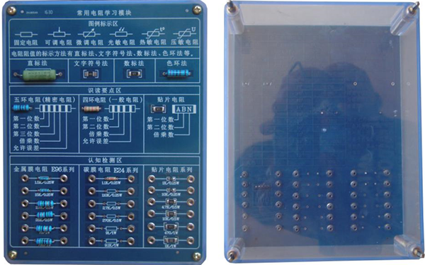 認知檢測區:提供碳膜電阻,包括1/4W、1/2W、1W三類(lèi)小功率共6個(gè)實(shí)際電阻,全部為E24系列阻值;金屬膜電阻1/4W、1/2W、1W三類(lèi)小功率共6個(gè)E96系列阻值實(shí)際電阻;貼片電阻類(lèi),包括1206、1812、2512三類(lèi)封裝形式共6個(gè)實(shí)際電阻。所有電阻兩端提供可供檢測的臺階插座(內孔2MM)。