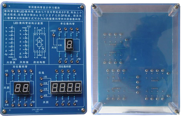 展示共陰及共陽(yáng)數碼管的結構示意圖及常用數字的數碼顯示方法,展示了單位數碼管、雙位數碼管、四位數碼管的實(shí)物并提供了可供檢測的臺階插座(內孔2MM)。