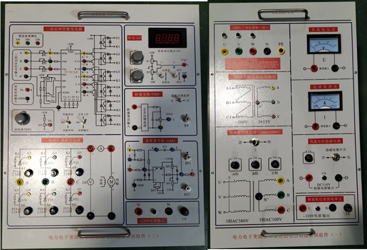 直流調速系統配套模塊:提供直流電壓表,直流電流表、三相同步電源、三相同步輸入信號(提供給脈沖觸發(fā)單元電路,內部已連接)以及勵磁電源,使用時(shí)首先確保關(guān)閉勵磁電源開(kāi)關(guān),將實(shí)訓導線(xiàn)接入三相同步變壓器輸入端,然后根據實(shí)訓需求將勵磁電源的輸入端與單相交流電源連接,檢查接線(xiàn)無(wú)誤后打開(kāi)三相同歩電源的輸入控制開(kāi)關(guān)。