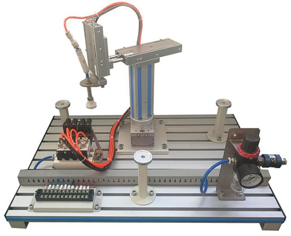 模型由回轉氣缸、雙軸氣缸、單軸氣缸、吸盤(pán)、真空發(fā)生器、電磁閥、節流閥、手滑閥、減壓閥、磁性開(kāi)關(guān)、機械部件、工業(yè)鋁合金型材底板等組成,設有兩個(gè)抓取工位,可進(jìn)行工件取放控制練習?砷_(kāi)展對氣動(dòng)機械手的操作及編程控制訓練。配有空氣壓縮機:靜音無(wú)油,工作電源AC220V±10% 50Hz,輸入功率0.68kW;公稱(chēng)容積24L,理論流量:116L/min,額定輸出氣壓0.7MPa。