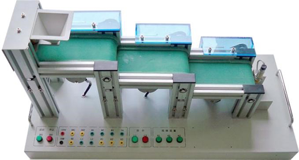 模型主要由漏斗上料裝置、三級傳送帶、直流電機、電磁鐵、電容傳感器、開(kāi)關(guān)、指示燈、鋁型材框架、安裝底板、手柄等組成,通過(guò)PLC編程,可完成自動(dòng)送料裝車(chē)系統的模擬控制。 |