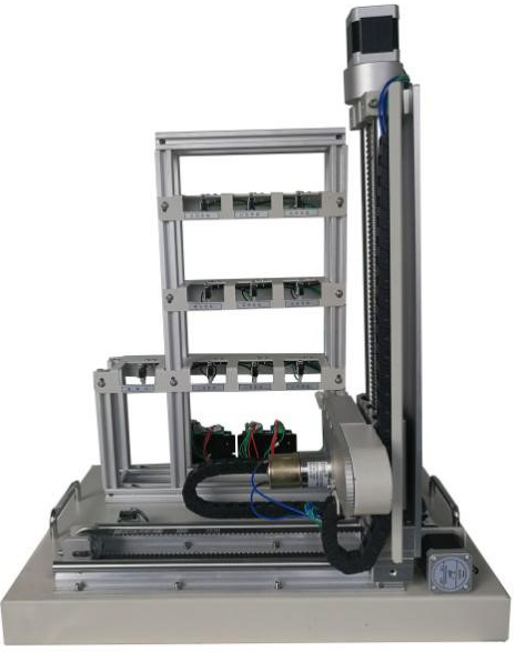 模型包含三層九倉位庫體、出/入庫倉位庫體、三維(X、Y、Z)運動(dòng)機械及電氣控制等部分組成;定位執行機構由豎軸和橫軸組成;驅動(dòng)機構由步進(jìn)電機及步進(jìn)電機驅動(dòng)器組成;傳動(dòng)軸為滾珠絲桿傳動(dòng)和雙軸導軌帶傳動(dòng),傳動(dòng)平穩。取物軸由直流減速電機驅動(dòng),可實(shí)現前后兩方向的運動(dòng)。 |