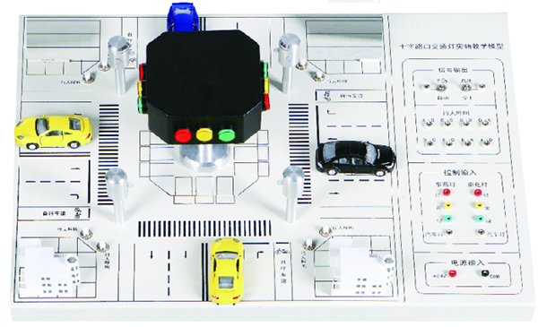 模型以實(shí)際十字路口按一定的比例微縮而成,配有道路模型、交通指揮燈、電氣控制接口區域等。具有指示和控制、啟/停按鈕、手/自動(dòng)按鈕、行人呼叫按鈕、四方向紅/黃/綠燈指示等功能。