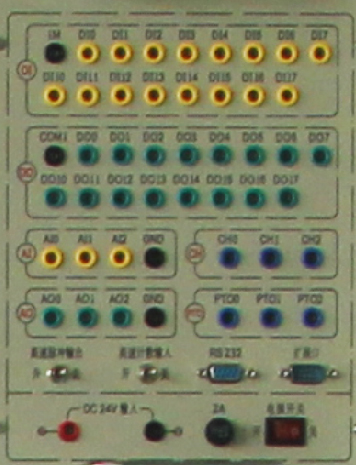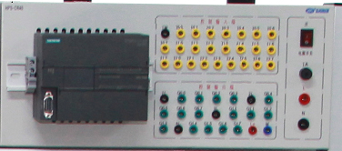 提供6路輸入、6路輸出等接口,輸入、輸出端電壓可自由切換0V和24V,輸出端由指示燈的亮滅來(lái)指示PLC輸出口的狀態(tài),面板印有清晰的說(shuō)明和端口絲印。通過(guò)基本指令練習,讓學(xué)生掌握PLC輸入、輸出的外圍接線(xiàn)和工作原理。