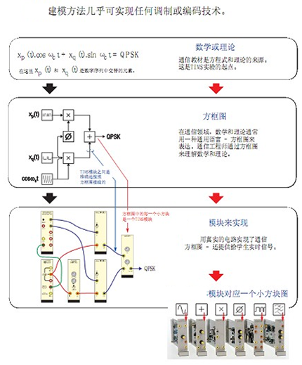 通信系統原理實(shí)驗室主要設備采用設計型開(kāi)放式設計理念,跟以往驗證型實(shí)驗設備有本質(zhì)區別。整個(gè)系統采用基于方框圖的模塊化設計,以數學(xué)函數方框圖形式來(lái)確定硬件基本模塊,靈活組合模塊以實(shí)現任何調制或編碼技術(shù)。