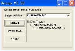 (1)運行“372drive”文件夾中的USB驅動(dòng)程序CH372DRV.EXE。在圖1中的界面選擇INSTALL,完成USB口驅動(dòng)的安裝。