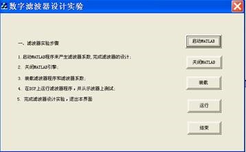 在“信號與系統在線(xiàn)設計程序”界面上選擇“濾波器設計”,即可以通過(guò)MATLAB設計濾波器系數,并加載到DSP中運行,通過(guò)實(shí)驗箱測試濾波器的特性。界面如圖5所示。界面上介紹了操作步驟,并包含“啟動(dòng)MATLAB”、“關(guān)閉MATLAB”、“裝載”、“運行”、“結束”等按鈕。