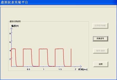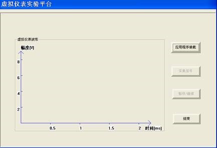 在“信號與系統在線(xiàn)設計程序”界面上選擇“虛擬儀表”按鈕,出現虛擬儀表實(shí)驗平臺界面,如圖8所示。該實(shí)驗將實(shí)驗箱的信號采集到計算機端,在計算機顯示信號波形,完成一些儀表的功能。“虛擬儀表實(shí)驗平臺”包含“應用程序裝載”、“采集信號”、“暫停/繼續”、“結束”等按鈕,以及采集到的信號波形顯示區域。