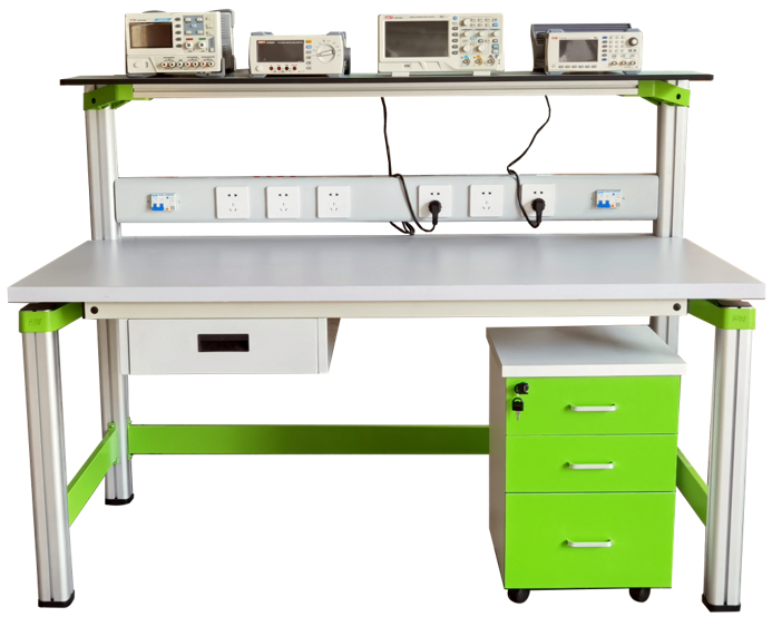 實(shí)訓桌規格為1500(長(cháng))*700(寬)*1150(高),設有一個(gè)抽屜;實(shí)驗桌主體結構全部采用高性能表面氧化的鋁型材及一次成型鋁壓鑄框架連接構件,連接構件采用壓鑄成型工藝(非焊接工藝),經(jīng)機加工、拋丸、噴砂,表面靜電噴涂工藝,安裝方便、快捷,用戶(hù)可自行DIY組裝。桌體立柱采用工業(yè)鋁型材成型工藝,表面氧化處理,截面尺寸:70mm×70mm,四面帶槽,槽寬約8mm,端部裝有注塑成型配套塑料堵頭。桌面采用25mmE1級三聚氰胺飾面板,桌面板下設支撐框架,承受力不少于300kg。配備儲存柜,存放元件及工具,儲存柜底部4只高強度萬(wàn)向可制動(dòng)PU腳輪,方便移動(dòng)。實(shí)訓裝置整體簡(jiǎn)約不簡(jiǎn)單,高端大氣,符合現代化產(chǎn)品審美和發(fā)展趨勢。