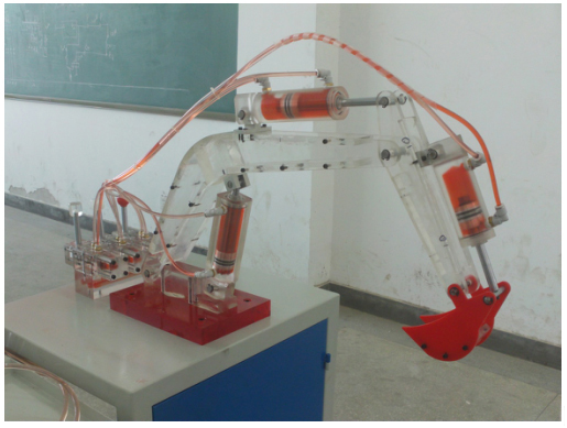 實(shí)訓臺主要由底柜,透明大臂,透明斗桿,透明挖斗(紅色),透明油缸,透明集成閥島,透明手動(dòng)換向閥,透明電磁閥,旋缸馬達,減速器等成