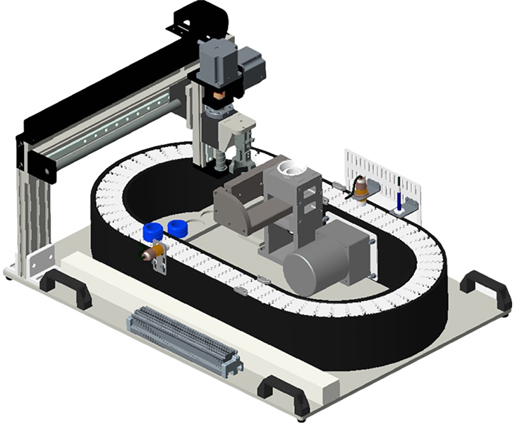 4.環(huán)形傳送分揀任務(wù)模型模型底板由8mm厚鋁板加工氧化而成,裝有四個(gè)黑色鑄鋁拉手,方便搬運。底板上方有環(huán)形輸送帶、氣動(dòng)機械手、搬運龍門(mén)架、分揀機構、變頻電機、伺服電機、步進(jìn)電機、多種傳感器及氣缸等組成。該任務(wù)模擬生產(chǎn)線(xiàn)自動(dòng)化控制,變頻器控制輸送帶電機實(shí)現調速功能;通過(guò)光纖、光電、金屬、RFID等多種傳感器檢測,PLC控制伺服、步進(jìn)、多種氣缸動(dòng)作完成上料、分揀、搬運等多種功能。同時(shí)為方便教學(xué),端口采用全開(kāi)放設計。