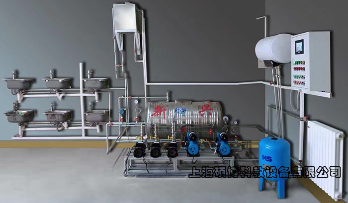 1、生活給水系統:主要有給水箱、給水泵、給水管道、壓力變送器、脈沖水表、水龍頭和淋浴頭等組成。管路采用不銹鋼管進(jìn)行設計,可進(jìn)行不銹鋼管的切割、安裝和通水試驗操作,通過(guò)控制系統可實(shí)現生活給水系統的變頻恒壓供水功能,實(shí)現單泵變頻控制或雙泵切換控制等功能;通過(guò)脈沖式水表可以完成用水量的計量。