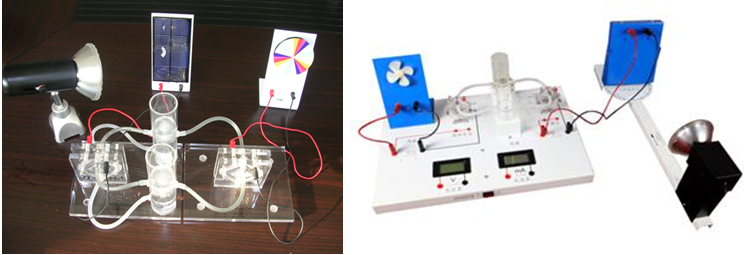 燃料電池教具是利用光線(xiàn)照射在太陽(yáng)能電池板上產(chǎn)生電能,然后利用產(chǎn)生的電能作用在電解電池模塊上,使水發(fā)生電解產(chǎn)生氫氣和氧氣。氫氣和氧氣進(jìn)入到發(fā)電模塊產(chǎn)生電能,帶動(dòng)風(fēng)扇轉動(dòng)。
