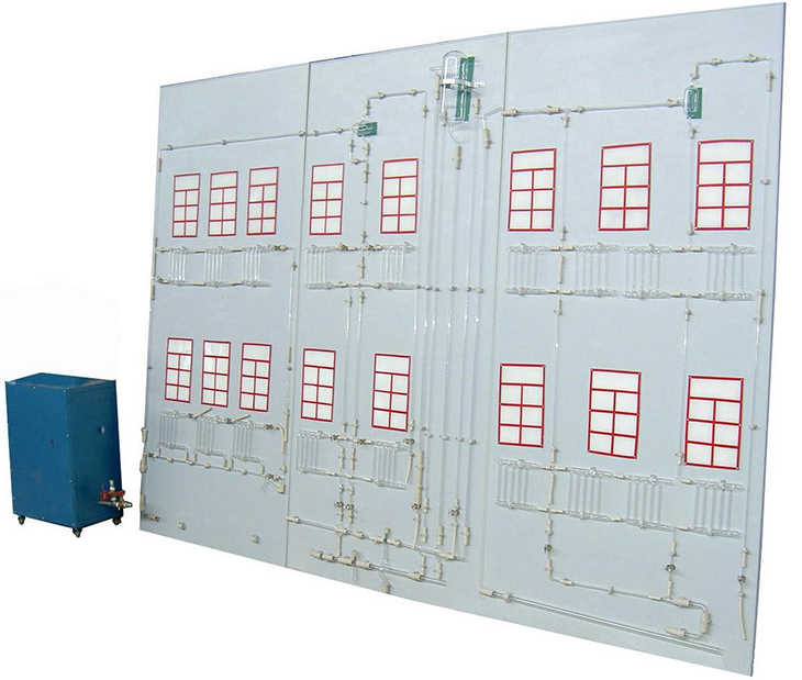 模擬采暖散熱器片、采暖供水干支管道、回水干支管道、集氣罐、高位膨脹水箱、溢水管、信號管、循環(huán)管、排水管、膨脹管、模擬房間墻面、模擬供暖鍋爐、供水泵、供水箱、實(shí)驗臺框架等。