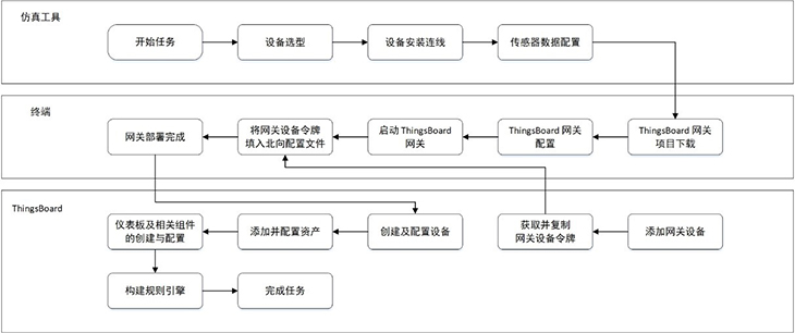 智慧溫室案例,引入了ThingsBoard IoT Gateway開(kāi)源解決方案,在AIoT平臺的仿真工具中部署ThingsBoard gateway網(wǎng)關(guān),以連接ThingsBoard云平臺,便于上送溫濕度傳感器數據,搭建恒溫機執行器模塊;ThingsBoard平臺,用戶(hù)可在儀表盤(pán)內添加設置智慧溫室場(chǎng)景、溫濕度顯示設備等組件,獲取仿真實(shí)驗中上送的虛擬數據,以動(dòng)態(tài)曲線(xiàn)的形式作可視化呈現;用戶(hù)還可根據案例要求,在ThingsBoard平臺的規則鏈庫中,自主編輯設定規則引擎,實(shí)現智慧溫室的恒溫控制與異常告警。