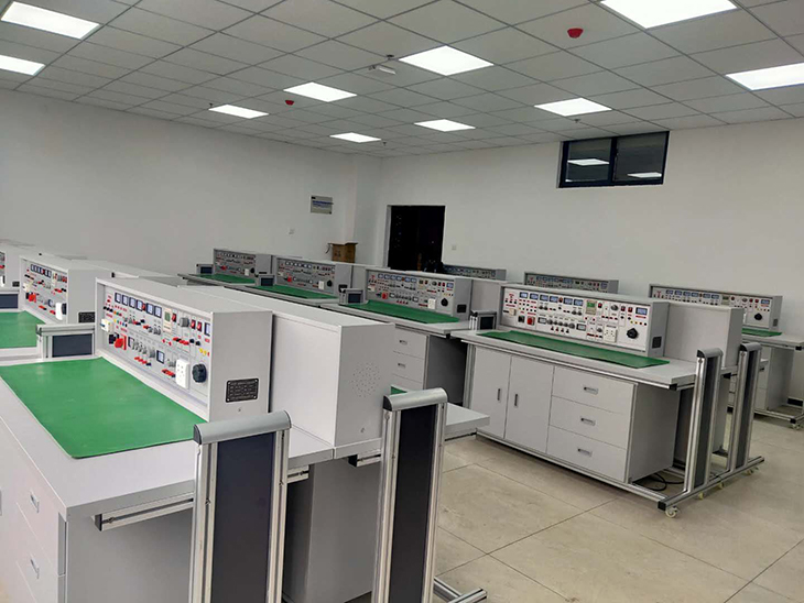3、示教控制臺:1臺示教控制臺,分別控制12臺學(xué)生臺的電源,通用電路板演示屏立在實(shí)驗臺上,尺寸150×70cm,用于講解、演示。