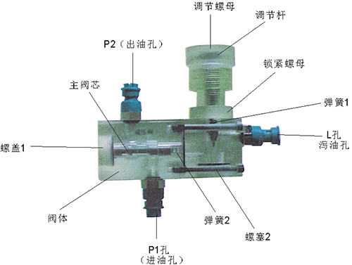 2、溢流閥結構上參考了國產(chǎn)P-63B型低壓直動(dòng)式溢流閥,其閥體閥蓋、鎖緊螺母、調節螺母、螺塞等采用了進(jìn)口透明有機玻璃材料精制而成,閥芯、調節桿采用了45#中碳鋼材料。并配合彈簧,油接頭,密封圈等標準件裝配而成,通過(guò)它可明確地觀(guān)察到閥芯、彈簧、油孔等結構及其運行過(guò)程,具有形象逼真,性能可靠等優(yōu)點(diǎn)。它即可作為教學(xué)模型,也可以作為液壓實(shí)驗元件進(jìn)行實(shí)驗演示。