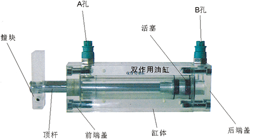 2、雙作用油缸的缸體,端蓋,行程撞塊,撞塊支承等均采用了進(jìn)口透明有機玻璃材料。頂桿采用了45#中碳鋼,并配合油接頭,密封圈,內六角螺絲等標準件精制而成。能通過(guò)它明確地觀(guān)察活塞、頂桿、油封、油孔等結構及其運行過(guò)程。