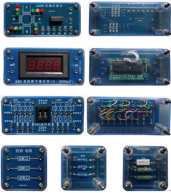 提供一套實(shí)訓模塊,可以完成模擬電子技術(shù)、數字電子技術(shù)和電子綜合應用實(shí)訓項目,電力電子技術(shù)應用等。實(shí)訓模塊面板采用PCB板制作而成,器件和信號接口均已引至板上的專(zhuān)用插座,實(shí)訓模塊有四個(gè)彈性插腳,與專(zhuān)用實(shí)訓孔板配套使用。