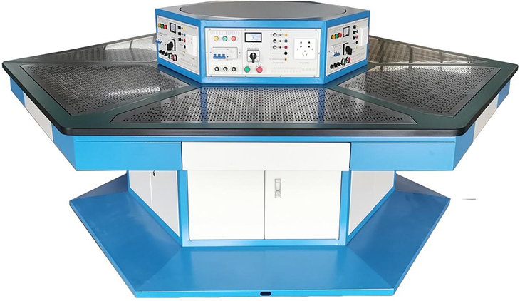 六邊形電源控制屏:電源控制屏采用六邊形結構,與工作臺相對應?蚣懿捎30 R的半圓形鋁型材經(jīng)過(guò)專(zhuān)用連接件組裝,頂面與底面采用1.2mm厚的優(yōu)質(zhì)鋼板連接。六個(gè)作業(yè)面均配置有實(shí)訓電源及主機控制系統,控制面板按鍵為薄膜輕觸式設計,具有漏電保護、短路保護功能。電源控制屏頂面采用10mm厚的鋁框包邊,內置有直徑為850mm的多角度公共操作平臺,公共操作平臺能360°旋轉,能做60°定位,平臺頂板采用10mm厚的鋁板加工成型,能載重約80Kg的典型工作任務(wù)。