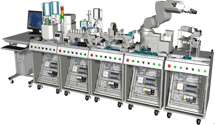 機電一體化綜合實(shí)訓考核系統是基于國家中長(cháng)期人才發(fā)展規劃綱要,對經(jīng)濟社會(huì )發(fā)展重點(diǎn)領(lǐng)域急需緊缺專(zhuān)門(mén)人才培養的需要,依據國家相關(guān)職業(yè)工種培養及鑒定標準,結合中國當前制造業(yè)的崗位需求設計研發(fā)。機電一體化綜合實(shí)訓考核系統由"工作站"形式綜合體現,"工作站"包含機電一體化"工作島",電氣裝配臺,機械裝配臺,工具、資料柜及其他附屬工作設施,不但讓操作者在工作中實(shí)習訓練了機電專(zhuān)業(yè)技能,同時(shí)也體驗到職業(yè)素養中的社會(huì )能力與方法能力。"工作站"的核心是"工作島",由MPS模塊化生產(chǎn)線(xiàn)設備組成,共分為液體混合灌裝、組裝加工、檢測判別、機器人和智能倉儲五個(gè)工作島設備組成,工作島由PLC、變頻器、伺服驅動(dòng)、步進(jìn)驅動(dòng)、氣動(dòng)元件、觸摸屏等工業(yè)控制器件構成,操作者需要具備機械裝調、電氣管路連接、程序設計、機器人操作、傳感器裝調、檢修排故、觸摸屏組態(tài)等現代制造業(yè)崗位必要的技能,設備技術(shù)涵蓋面廣,定位具有前瞻性,是機電一體化專(zhuān)業(yè)教學(xué)實(shí)習、技能鑒定和技能競賽的絕佳載體。