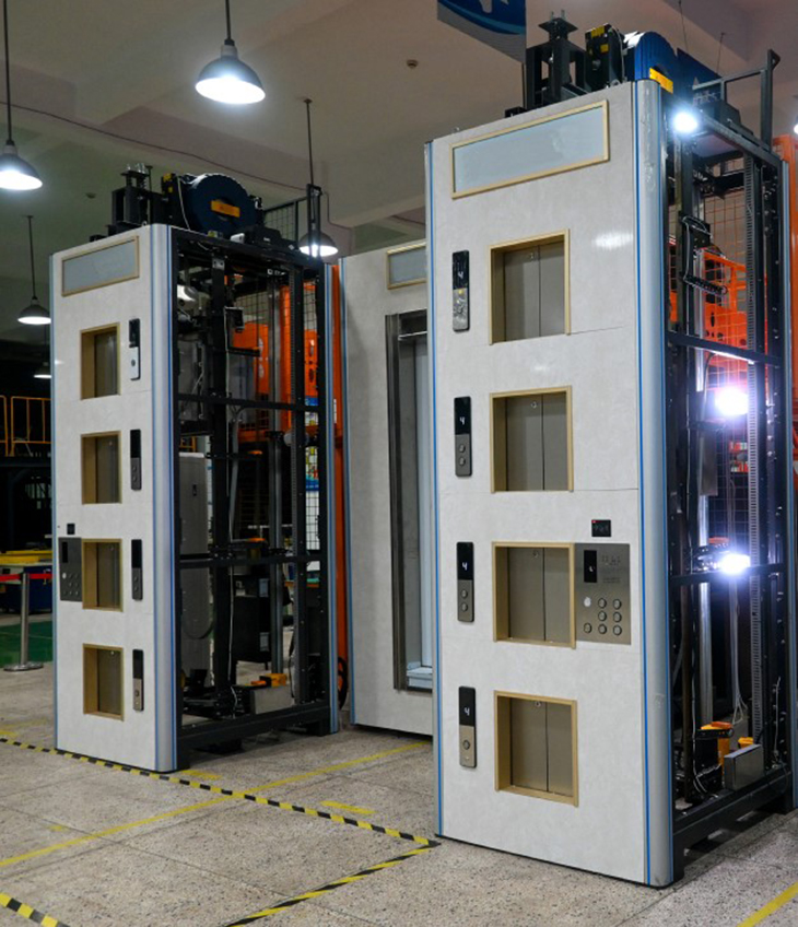 1、配備四層電梯對象系統,可進(jìn)行并聯(lián)或者群控,安裝有驅動(dòng)裝置、轎廂及對重裝置、導向系統、門(mén)機機構、外呼召喚盒、內呼操縱箱、安全保護機構等組成。驅動(dòng)裝置由同步永磁無(wú)齒輪曳引機(帶有制動(dòng)器、導向輪、工業(yè)編碼器)、曳引鋼絲繩和繩頭組合等部件組成;導向系統由井道鋼架、工業(yè)級導軌、導靴等組成;門(mén)機機構由轎門(mén)、層門(mén)、開(kāi)關(guān)門(mén)機構、安全觸板、門(mén)安全光幕保護、門(mén)機力矩安全保護、門(mén)套等部件組成;安全保護機構由超載裝置、緩沖器、安全鉗、限速保護裝置、終端極限開(kāi)關(guān)安全保護等部件組成。