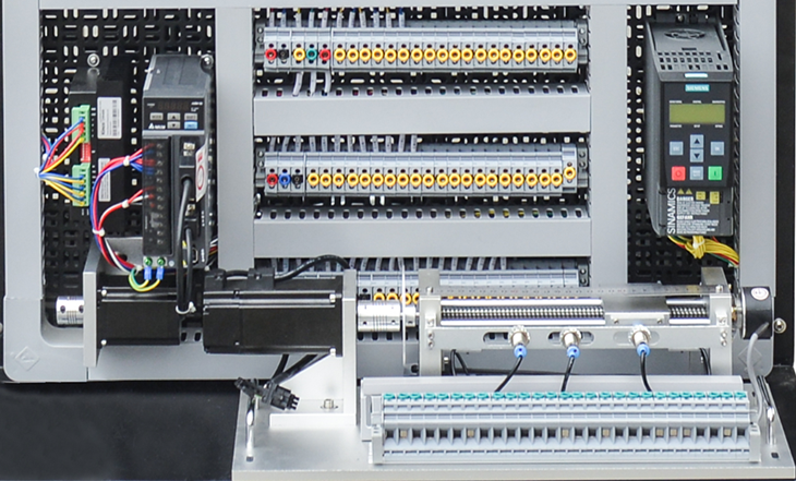 組成:伺服系統、步進(jìn)系統、變頻系統、小車(chē)運動(dòng)模塊、三相異步電動(dòng)機模塊;