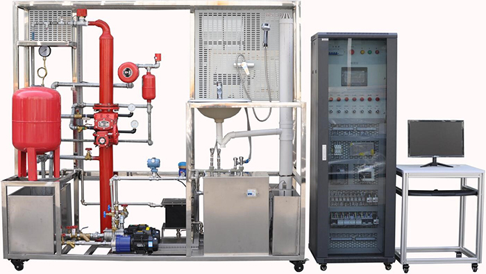 生活給水系統主要有給水箱、給水泵、給水管道、壓力變送器、脈沖水表、水龍頭和淋浴頭等組成。管路采用不銹鋼復合管進(jìn)行設計,可進(jìn)行不銹鋼復合管的切割、安裝和通水試驗操作,通過(guò)控制系統可實(shí)現生活給水系統的變頻恒壓供水功能,實(shí)現單泵變頻控制或雙泵切換控制等功能;通過(guò)脈沖式水表可以完成用水量的計量。