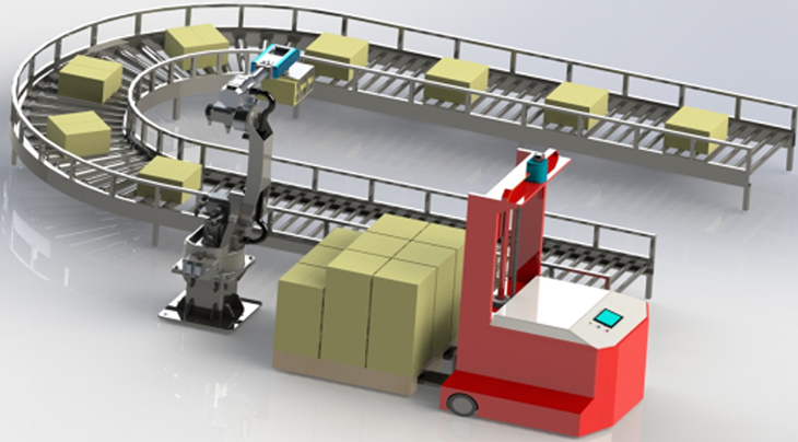碼垛機器人系統由機器人、來(lái)料流水線(xiàn)、托盤(pán)、AGV叉車(chē)、安全圍欄及電氣系統構成。產(chǎn)品通過(guò)來(lái)料流水線(xiàn)輸送至機器人工作站內,系統檢測到有產(chǎn)品進(jìn)入搬運區域,機器人自動(dòng)運行,將產(chǎn)品碼放在托盤(pán)上。碼盤(pán)完成AGV叉車(chē)將碼好的托盤(pán)叉至薄膜纏繞機進(jìn)型固定。碼垛機器人教學(xué)系統內部裝有碼垛軟件,自動(dòng)計算每個(gè)擺放的層數及位置,托盤(pán)擺滿(mǎn)后,托盤(pán)輸送線(xiàn)將托盤(pán)推出機器人系統,等待轉運。該系統最大可能的模擬實(shí)際生產(chǎn)時(shí),設備運行的方式及可能出現的狀況,對學(xué)生掌握機器人的操作及了解實(shí)際工廠(chǎng)的生產(chǎn)流程有極大的幫助。另外,根據具體要求,系統還可以增加視頻監控,根據工件種類(lèi)掃碼分類(lèi)等功能。