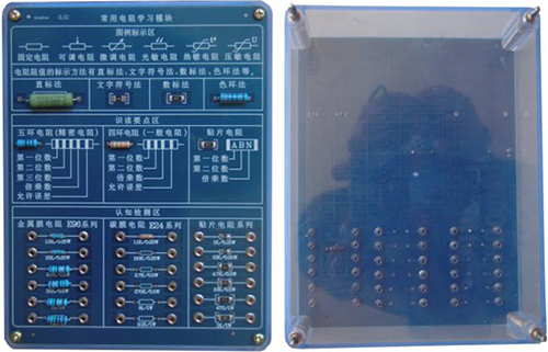 底盒使用190mm×145mm的開(kāi)模有機透明塑料底盒,模塊面板采用印制電路板PCB工藝,可以直觀(guān)看到器件的實(shí)物及相關(guān)的原理介紹。對于典型應用及易損器件安裝在面板背面,透過(guò)透明底盒能夠看到器件實(shí)物,方便感性認識、檢測測試,同時(shí)也能防止器件的損傷。