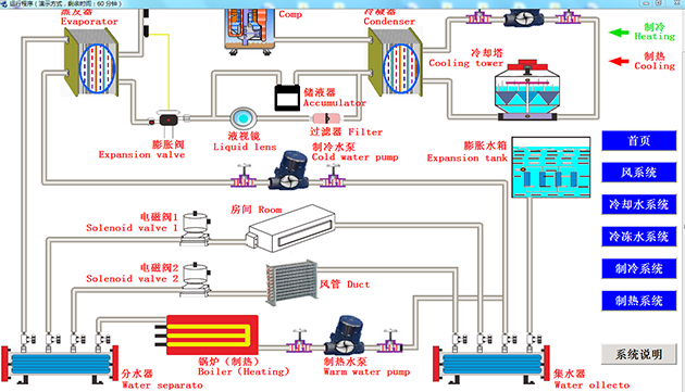 (2)、是系統動(dòng)畫(huà)演示:如壓縮機系統、制冷系統、制熱系統、風(fēng)系統、集中送風(fēng)系統、半集中送風(fēng)系統的原理過(guò)程。