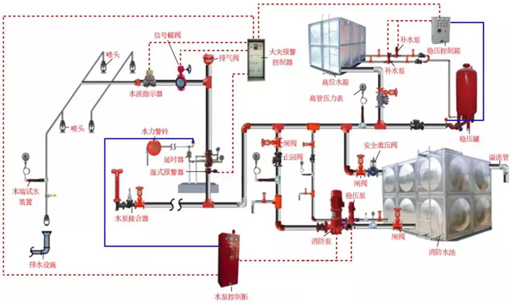 消防泵、穩壓泵、氣壓罐、閘閥、消防水箱、水泵控制電箱、管網(wǎng)壓力表、電接點(diǎn)壓力表、泄壓閥、柔性接頭、過(guò)濾器、泄水閥、DN100鍍鋅管、濕式報警閥組、干式閥組、預作用閥組、雨淋閥組、末端試水裝置、各種噴頭、信號蝶閥、水指、排氣閥、末端試水箱 |