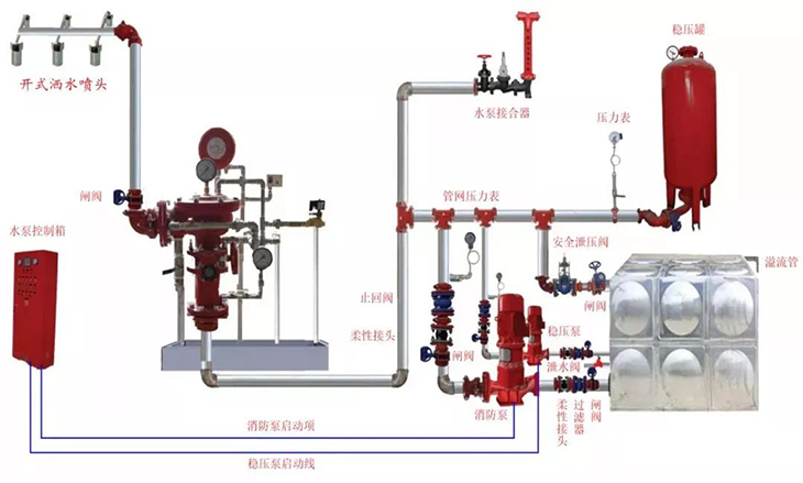 由閉式灑水噴頭、水流指示器、預作用報警閥組以及管道和供水設施等組成,準工作狀態(tài)時(shí)配水管道內不充水,由火災自動(dòng)報警系統自動(dòng)開(kāi)啟雨淋報警閥后,轉換成為濕式系統的閉式系統。