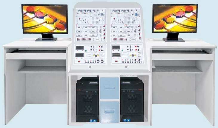 雙工位同步教學(xué)平臺:尺寸:800×600×1200mm 材質(zhì):ABS 厚度5毫米,平臺后部采用透明有機玻璃;平臺下端兩側擺放電腦主機,主機中間另有兩個(gè)抽屜存放實(shí)驗器材,平臺上部擺放2個(gè)工位的數/模電同步互動(dòng)教學(xué)系統硬件模塊。 |