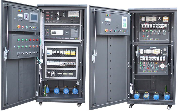 1.本裝置采用標準配電柜為主體柜,充分利用該柜雙面空間位置,其中裝有可方便拆卸的電源控制、交直流電源、測量?jì)x表、低壓電氣器件,另一面裝有PLC模擬量模塊、變頻器、直流調速模塊、機床智能考核,該配電柜占地面積小,外形美觀(guān);