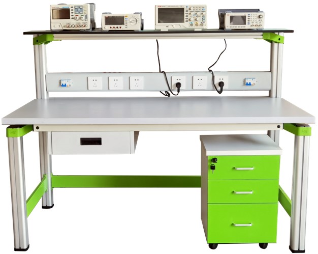 (三)實(shí)訓桌結構:實(shí)訓桌規格為1600(長(cháng))*700(寬)*1150(高),設有一個(gè)抽屜;實(shí)驗桌主體結構全部采用高性能表面氧化的鋁型材及一次成型鋁壓鑄框架連接構件,連接構件采用壓鑄成型工藝(非焊接工藝),經(jīng)機加工、拋丸、噴砂,表面靜電噴涂工藝,安裝方便、快捷,用戶(hù)可自行DIY組裝。桌體立柱采用工業(yè)鋁型材成型工藝,表面氧化處理,截面尺寸:70mm×70mm,四面帶槽,槽寬約8mm,端部裝有注塑成型配套塑料堵頭。桌面采用25mmE1級三聚氰胺飾面板,桌面板下設支撐框架,承受力不少于300kg。配備儲存柜,存放元件及工具,儲存柜底部4只高強度萬(wàn)向可制動(dòng)PU腳輪,方便移動(dòng)。實(shí)訓裝置整體簡(jiǎn)約不簡(jiǎn)單,高端大氣,符合現代化產(chǎn)品審美和發(fā)展趨勢。