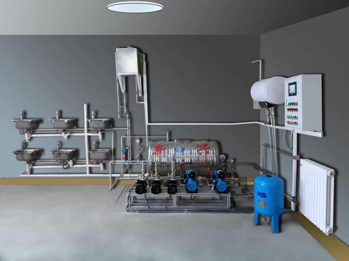 1、生活給水系統:主要有給水箱、給水泵、給水管道、壓力變送器、脈沖水表、水龍頭和淋浴頭等組成。管路采用不銹鋼管進(jìn)行設計,可進(jìn)行不銹鋼管的切割、安裝和通水試驗操作,通過(guò)控制系統可實(shí)現生活給水系統的變頻恒壓供水功能,實(shí)現單泵變頻控制或雙泵切換控制等功能;通過(guò)脈沖式水表可以完成用水量的計量。