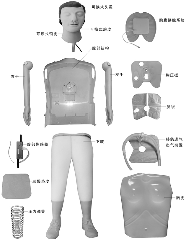 頭發(fā)、面部皮膚、頸皮膚、胸皮膚采用進(jìn)口熱塑彈性體混合膠材料,由不銹鋼摸具、經(jīng)注塑機高溫注壓而成,頭發(fā)、面部皮膚、頸皮膚、胸皮膚可自由更換。