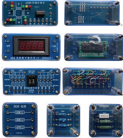 實(shí)訓模塊由透明元件盒及PCB板構成,元件盒是組合式透明元件盒,元件盒單元組采用多元件、典型實(shí)訓單元電路、典型傳感器、通用集成電路插座等制成,可根據實(shí)訓需要方便地組合成不同的電工電子實(shí)訓線(xiàn)路;使實(shí)訓具有開(kāi)放性和創(chuàng )新性,元件盒體由透明有機工程塑料注塑而成,具有示教功能,使使用者能夠觀(guān)察到元件形狀和接線(xiàn)方式,有利于教師講解和學(xué)生認識;面板采用PCB制作而成,表面清爽、符號線(xiàn)路清晰、表面耐磨損、元件更換容易;面板上標志的元件電路符號采用最新國家標準,具有整體結構緊湊、外形美觀(guān)大方、安裝簡(jiǎn)單、使用保管方便等特點(diǎn)。導線(xiàn)插孔采用防轉座,導線(xiàn)裝有彈性插頭可在模塊上面插接,以保證可靠連接進(jìn)行各種實(shí)訓;實(shí)訓時(shí)可根據實(shí)訓內容和技能訓練的需要,方便的任意組合實(shí)訓線(xiàn)路,以完成不同的實(shí)訓項目等。