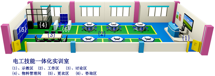 技能工作島由六邊形工作臺、六邊形電源控制屏及典型工作任務(wù)組成,能同時(shí)容納6名學(xué)生在設備上進(jìn)行操作。