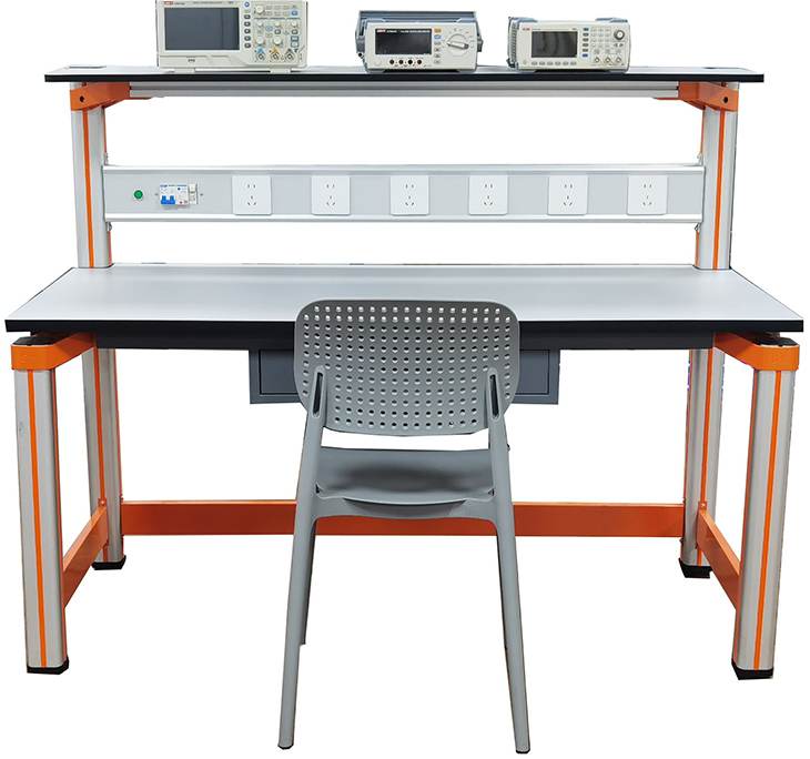 實(shí)驗桌后面二支截面尺寸70mm×70mm桌腳向上延伸,與一次成型鋁壓鑄框架連接構件構成(非焊接工藝)牢固的支架,與儀器架、電源控制箱組成一個(gè)完整的實(shí)訓屏。