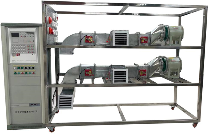 系統由模擬房間配備系統和排煙風(fēng)機系統組成(主要由風(fēng)口、風(fēng)閥和排煙風(fēng)機、排煙防火閥、送風(fēng)機、送風(fēng)風(fēng)道以及排煙風(fēng)道和相關(guān)的火災探測器、聯(lián)動(dòng)控制系統組成