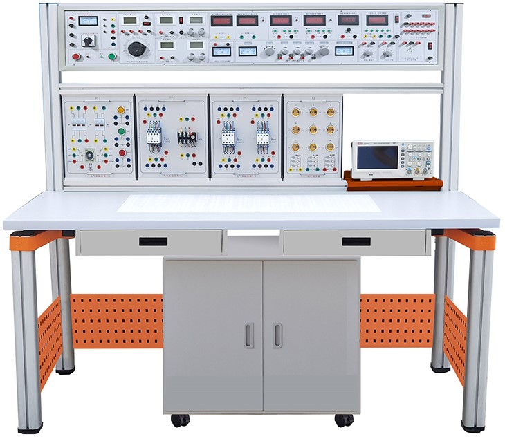 裝置由主機箱、實(shí)訓桌、實(shí)訓屏、實(shí)訓掛箱、移動(dòng)矮柜、示波器架、學(xué)生凳等組成。實(shí)訓裝置支架與實(shí)訓桌可組合、可拆裝。支架與桌腳一體,鋁合金結構,實(shí)訓掛箱、各實(shí)訓模塊可根據實(shí)訓需求自由組合放置。