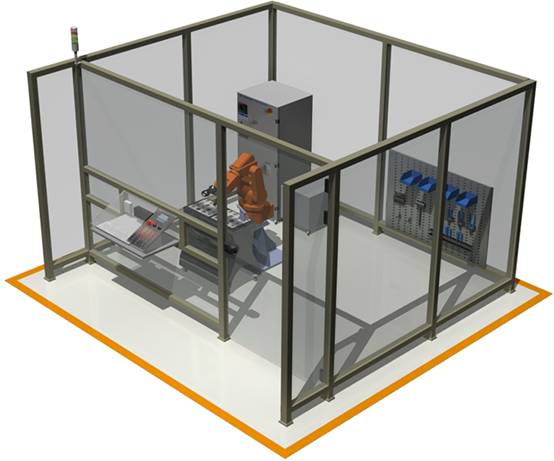 安全護欄:隔離護欄,高1000mm,框架采用2mm厚灰色棟梁鋁合金型材,鋼化玻璃10mm厚;工作站全部通透利于觀(guān)察,玻璃中間沒(méi)有隔斷;并安裝一個(gè)側開(kāi)門(mén);門(mén)上安裝安全檢測元件,機器人自動(dòng)運行必須在門(mén)關(guān)閉狀態(tài)下進(jìn)行;系統工作站安裝有3個(gè)急停按鈕,分別位于操作控制臺、模型安裝臺、隔離護欄上,以備緊急情況使用。