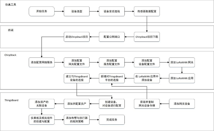 模擬智慧牧場(chǎng)系統還引入使用開(kāi)源軟件平臺ChirpStack與ThingsBoard,結合LPWAN技術(shù),實(shí)現遠程低功耗數據采集、上報和展示。在ChirpStack平臺上,用戶(hù)可對網(wǎng)關(guān)、GPS、溫濕度傳感器等設備進(jìn)行配置,以上送仿真實(shí)驗中的虛擬數據。在ThingsBoard平臺上,設置牧場(chǎng)地圖、告警信息、溫濕度等各儀表盤(pán)組件;獲取仿真設備上送的數據,并將數據以圖表形式作可視化呈現;以及基于流式編程添加相應的規則策略,最終完成模擬智慧牧場(chǎng)實(shí)訓場(chǎng)景的部署搭建。