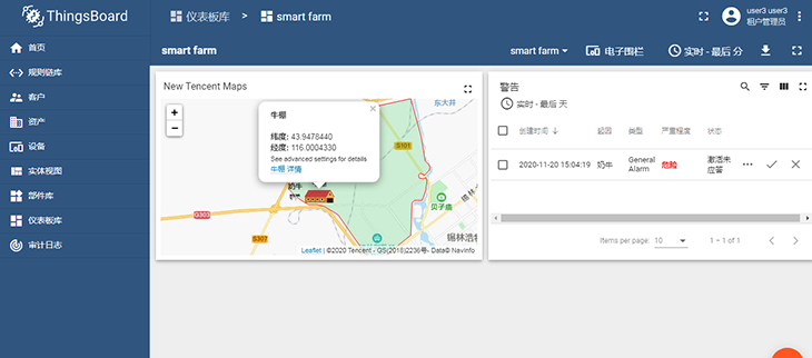 圖:智慧牧場(chǎng)課程案例,使用GPS對奶牛位置進(jìn)行定位,通過(guò)LoRa網(wǎng)絡(luò )將位置信息上報,使用ThingsBoard平臺的電子圍欄工具結合騰訊地圖,實(shí)現奶牛越過(guò)電子圍欄時(shí)發(fā)送警報提醒。
