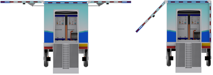 (2)、左、右翼板分別由6個(gè)液壓油缸負責組成動(dòng)力,左右兩翼各3個(gè)。按照控制器上標明分別將"右翼板"、"左翼板"依次展開(kāi)。